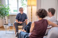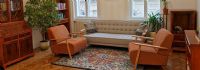 Sitzgruppe Praxisraum Dr. Stephan Hametner Gesamtansicht der Sitzgruppe im Praxisraum von Dr. Stephan Hametner. Der Raum kann verschieden ausgeleuchtet werden, der Blick durchs Fenster geht in einen wunderbaren Garten in Innenstadtlage. Das Setting ist je nach Bedarf veränderbar. Direkt vom Praxisraum aus kann ein separates WC besucht werden