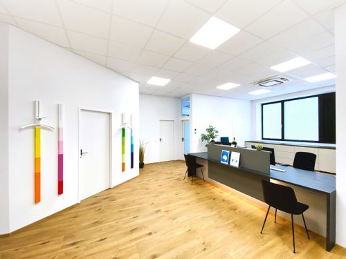 Der Praxisraum wirkt einladend und gemütlich, mit einem klaren Fokus auf Wohlbefinden und Vertrautheit. Die Einrichtung kombiniert warme Gelbtöne der Sitzmöbel mit einem dezenten, modernen Stil. Ein zentral platzierter Couchtisch schafft eine angenehme Gesprächsatmosphäre. Die weichen Vorhänge lasse