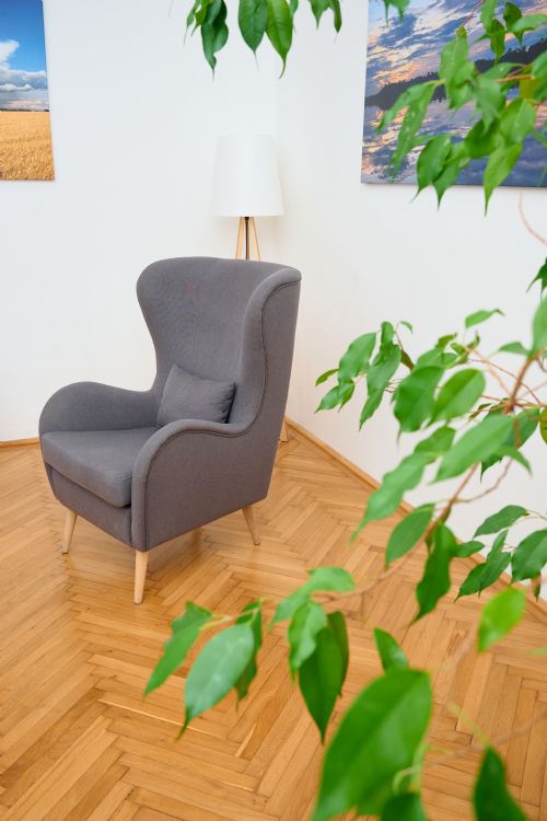 Zwei gemütliche Therapiestühle zur Gesprächsführung in angenehmer Atmosphäre.