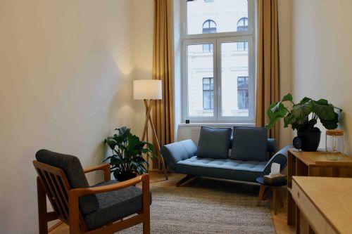 modern eingerichteter Praxisraum im 7. Liftstock mit wunderbarem Blick auf den Donaukanal