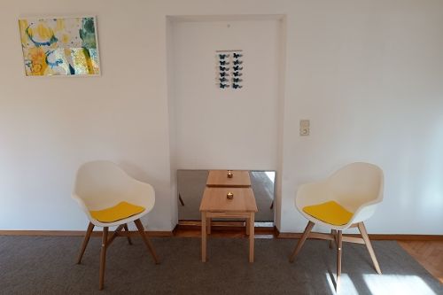 Gesamtansicht der Sitzgruppe im Praxisraum von Dr. Stephan Hametner. Der Raum kann verschieden ausgeleuchtet werden, der Blick durchs Fenster geht in einen wunderbaren Garten in Innenstadtlage. Das Setting ist je nach Bedarf veränderbar. Direkt vom Praxisraum aus kann ein separates WC besucht werden